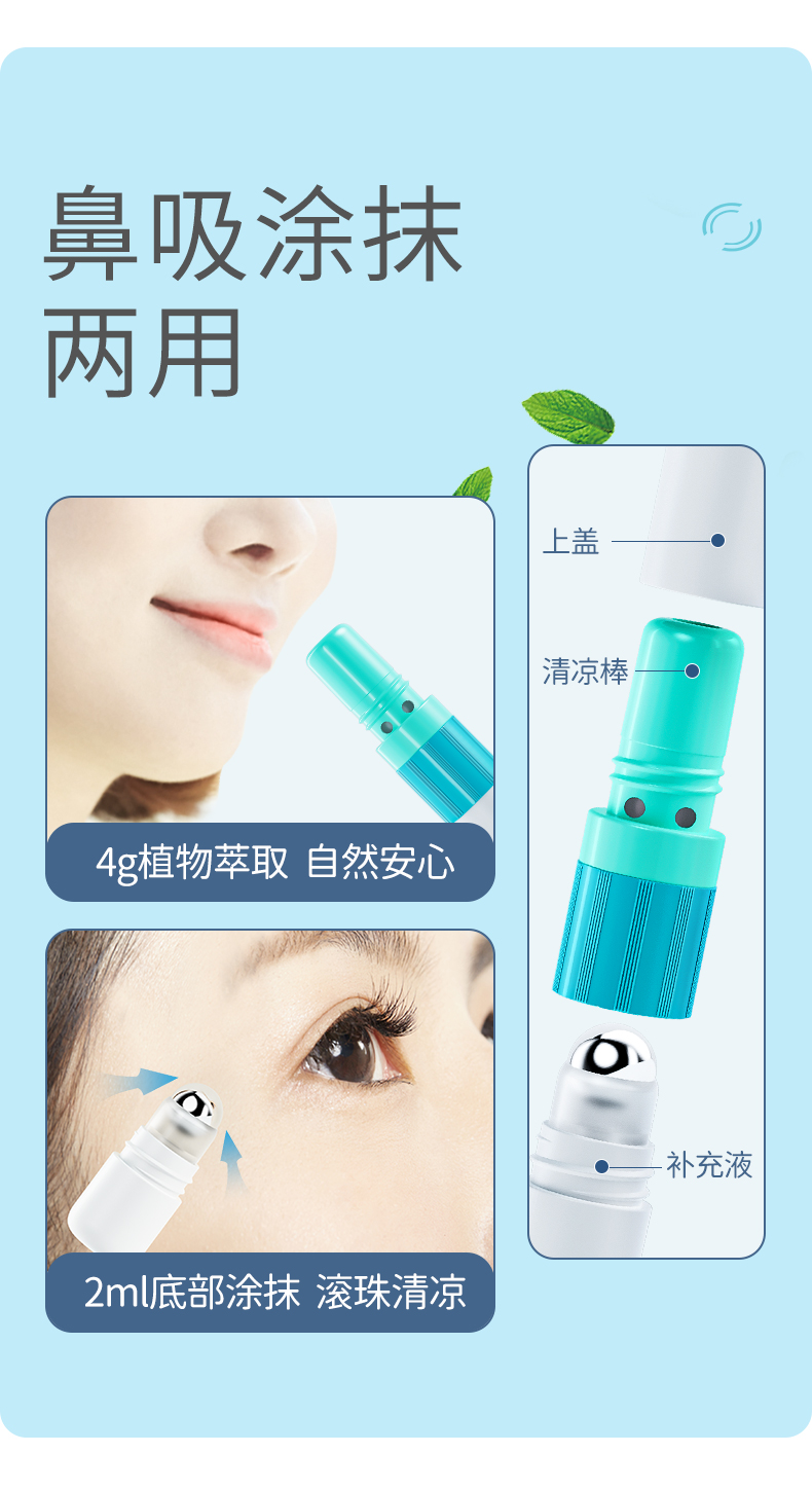 鼻吸涂抹两用,很多人坐车都都容易晕车,这时候可以涂在人中或者太阳穴,还能防晕车。