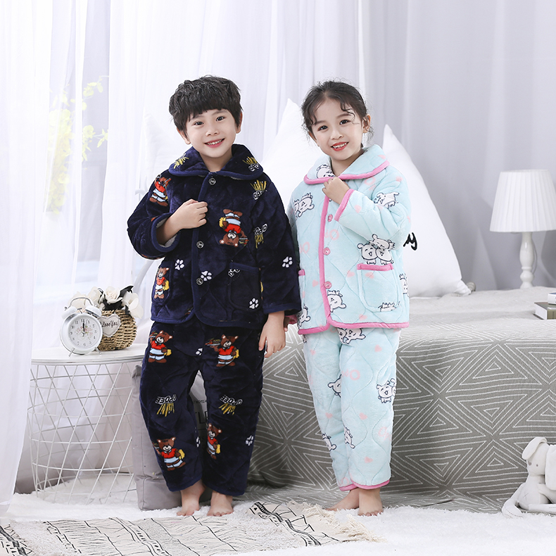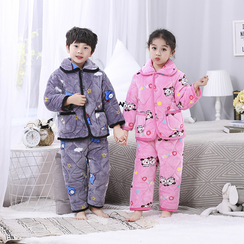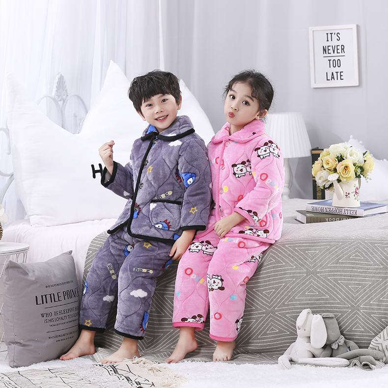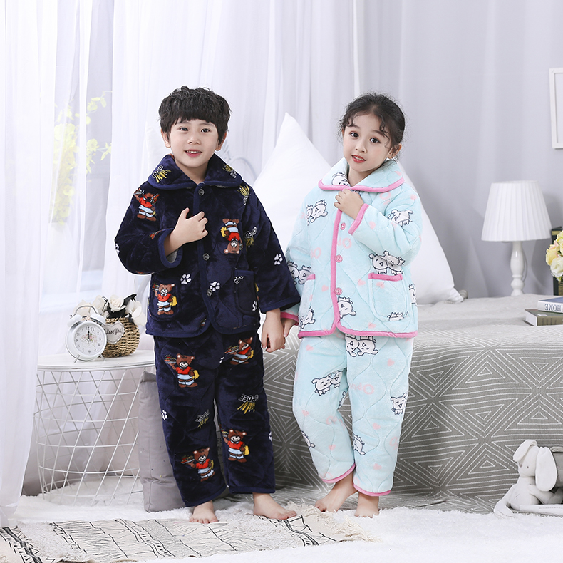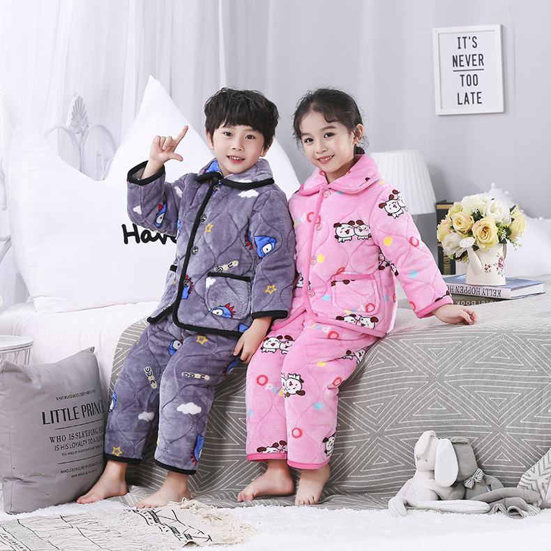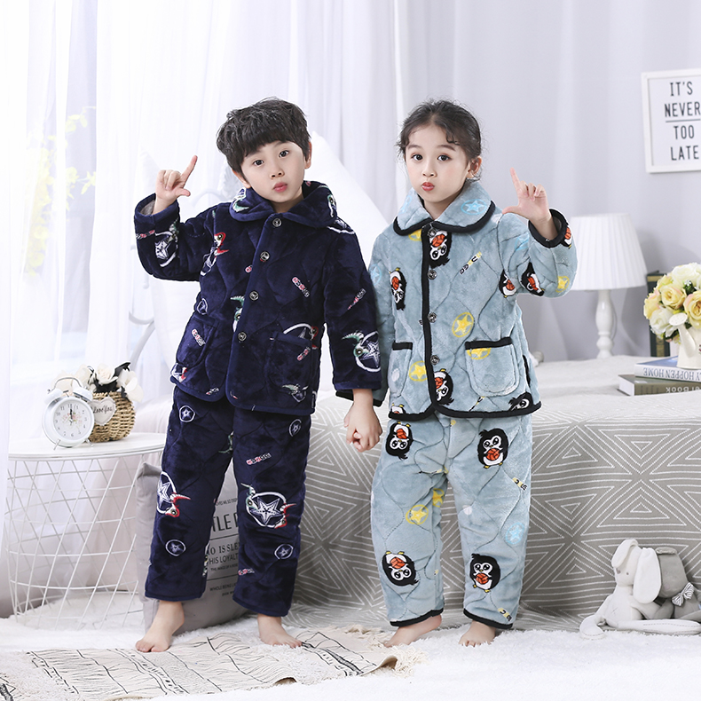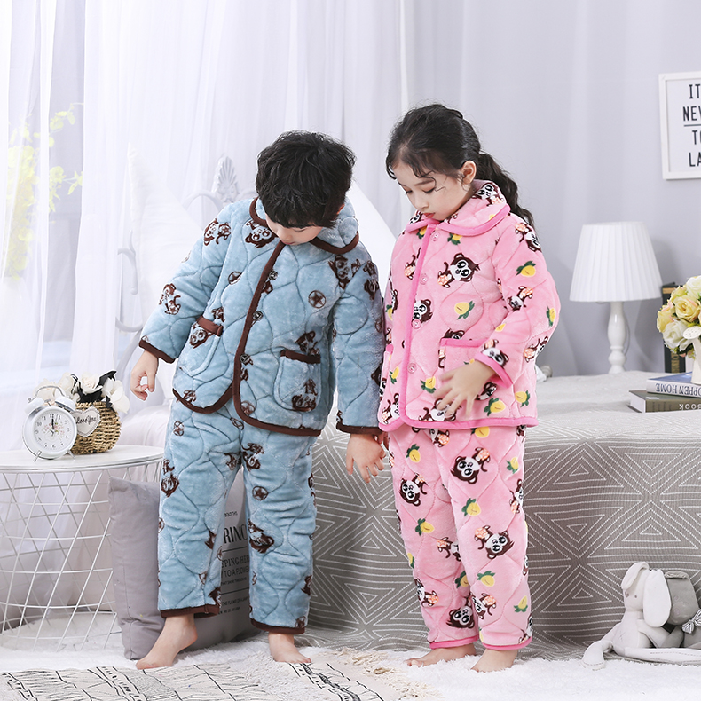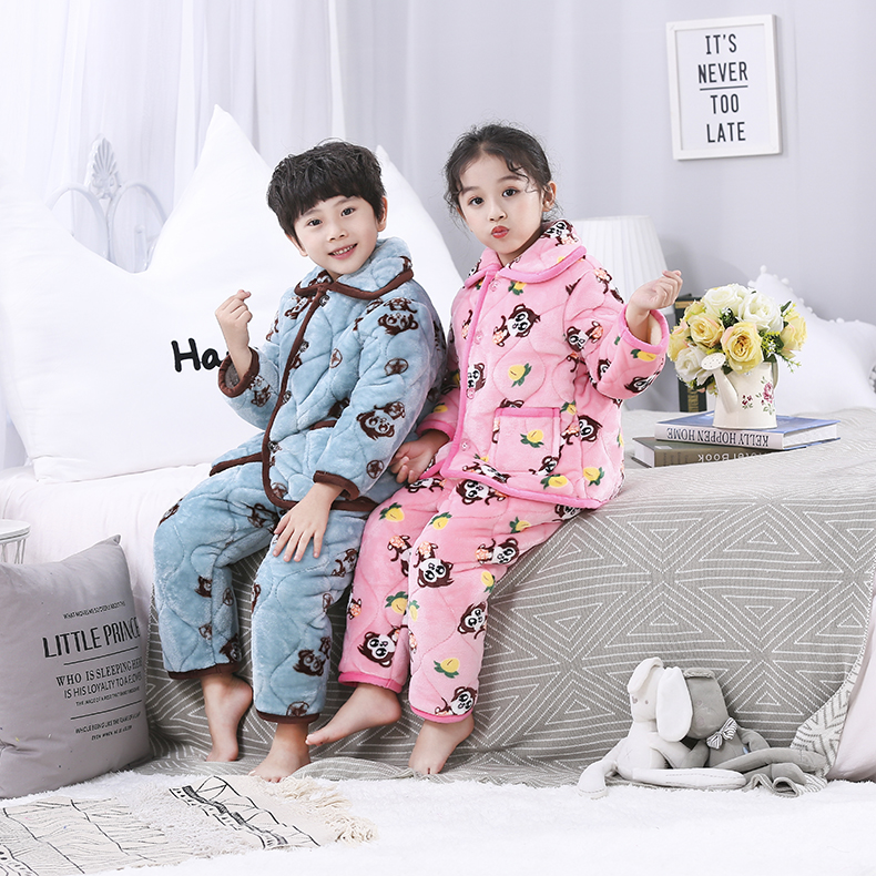 opoee男童宝宝睡衣加厚秋冬法兰绒女童加绒三层棉保暖儿童家居服