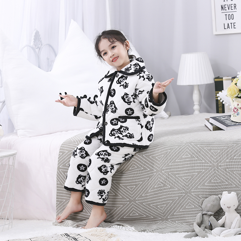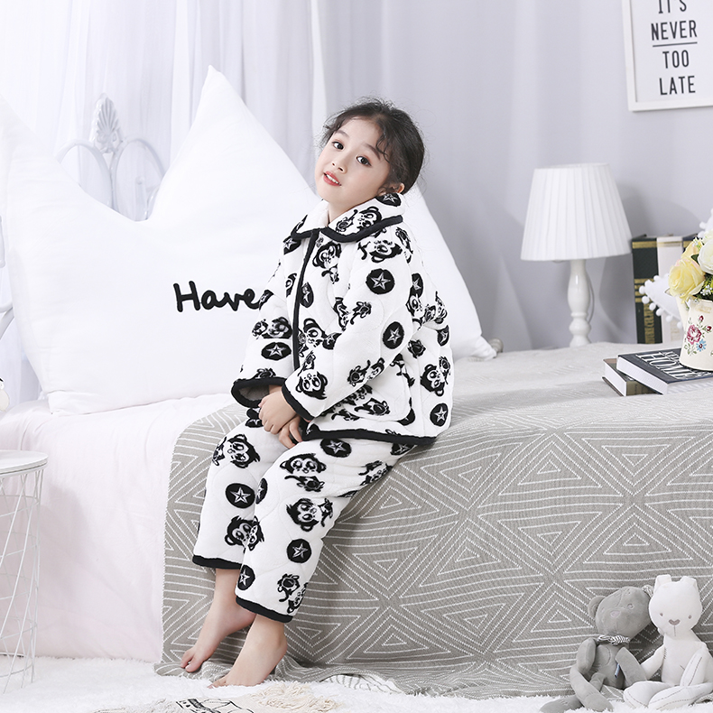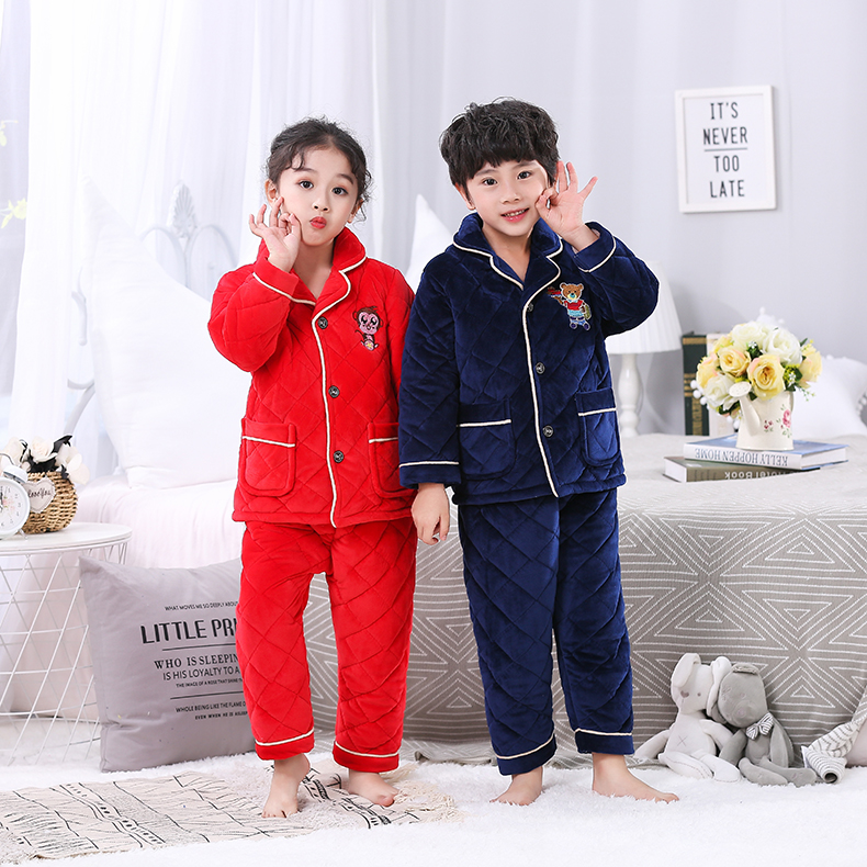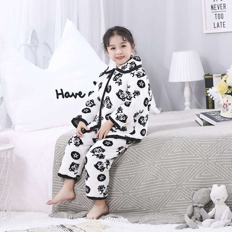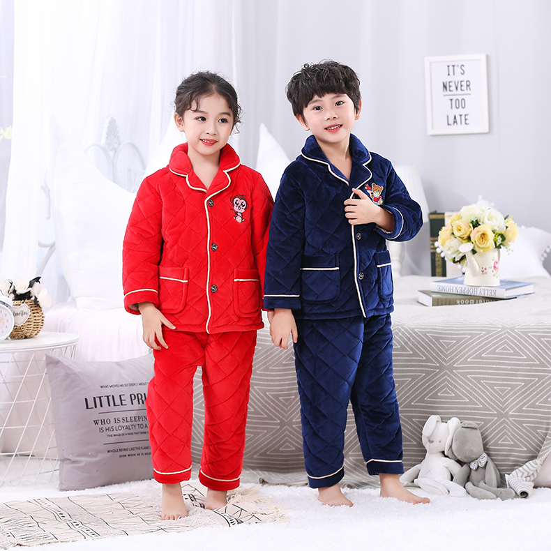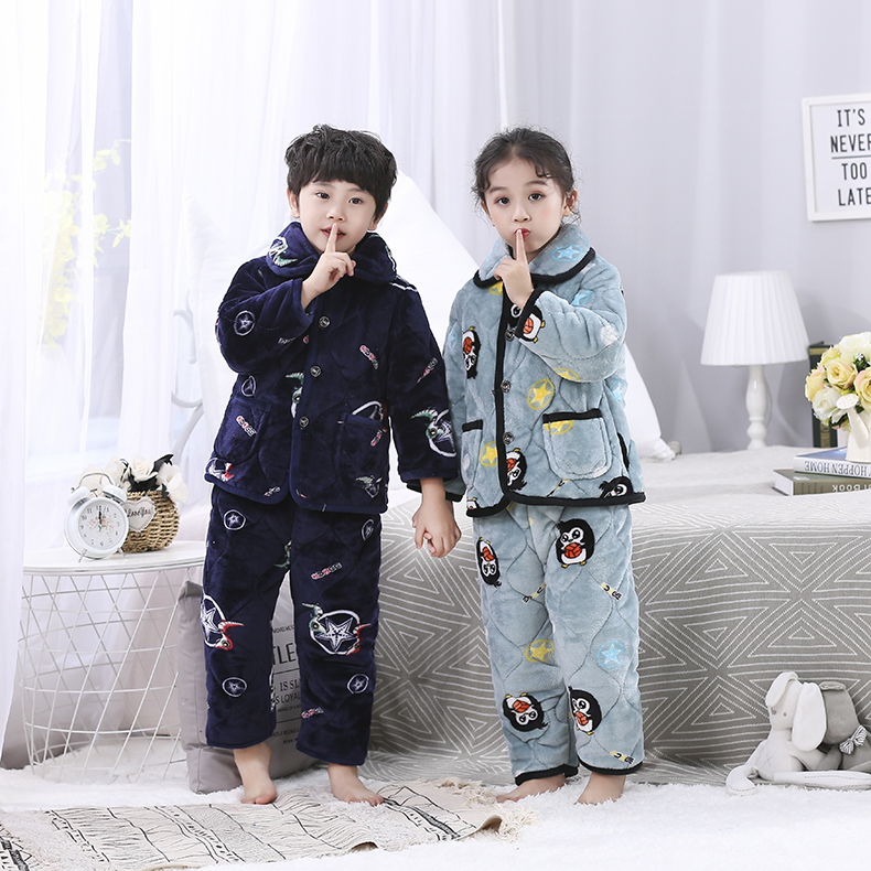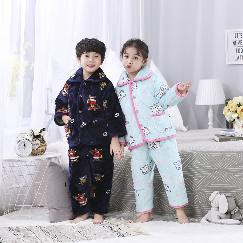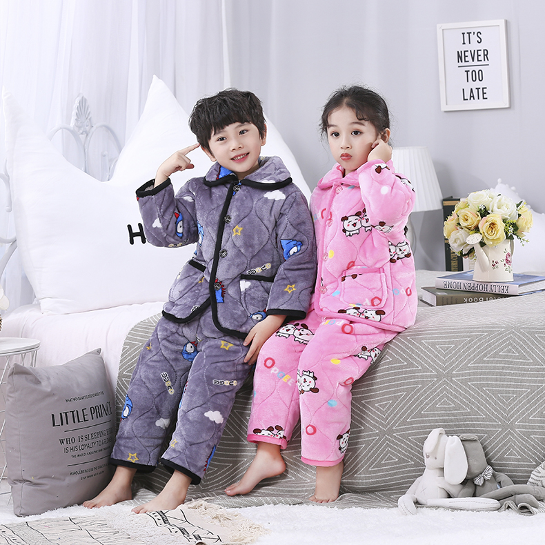 opoee男童宝宝睡衣加厚秋冬法兰绒女童加绒三层棉保暖儿童家居服