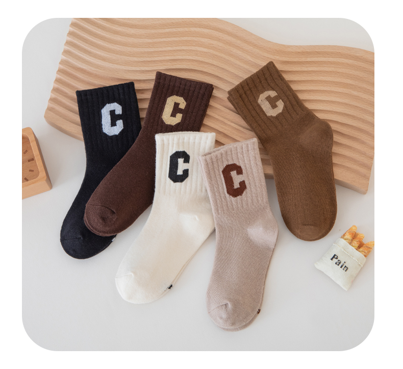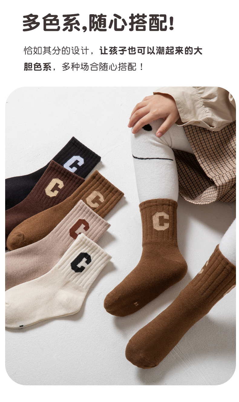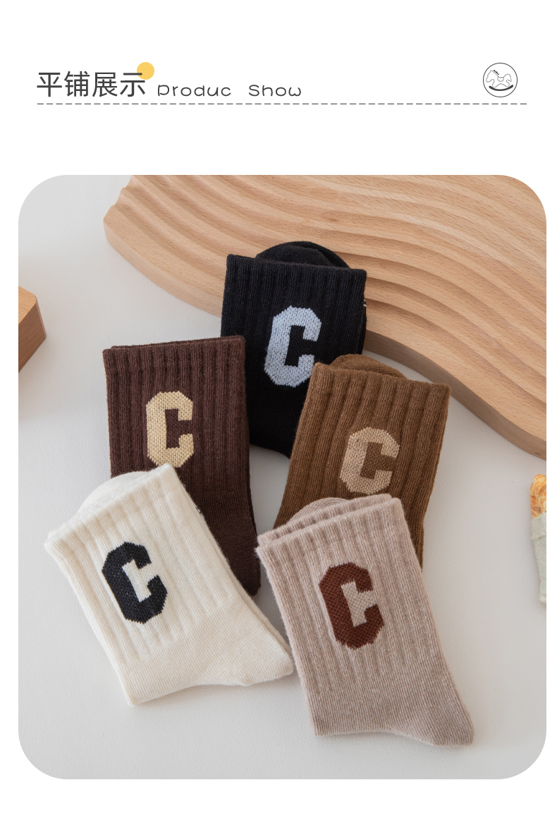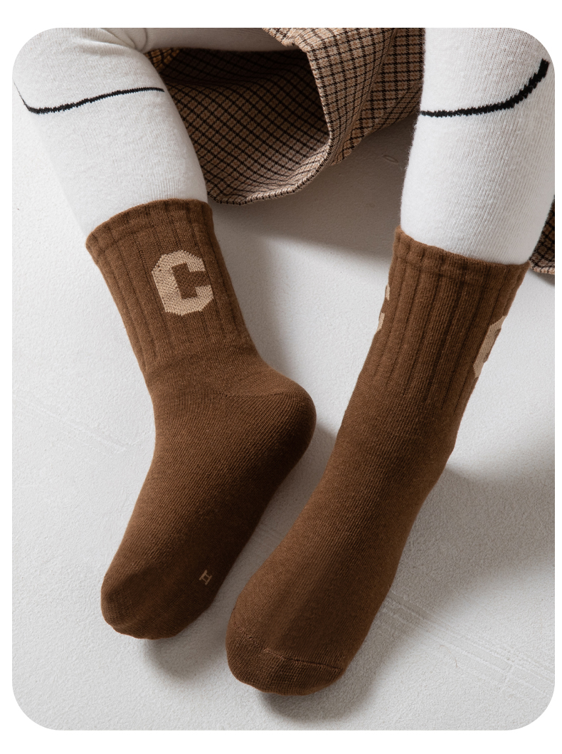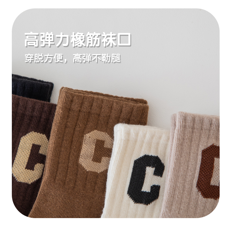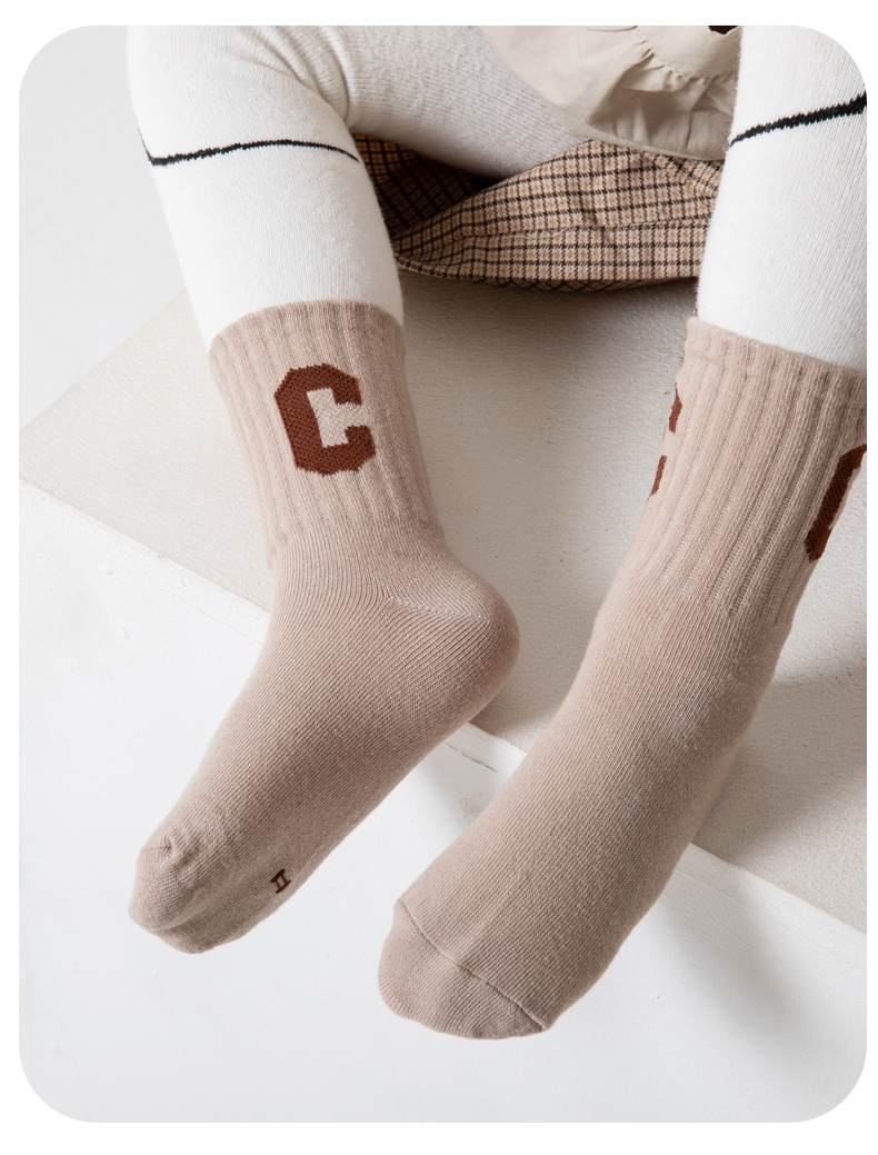 [保暖又好看]儿童袜子秋冬季咖色系C字母棉袜中筒袜男童女童潮袜宝宝袜W062[去首页领现金红包]