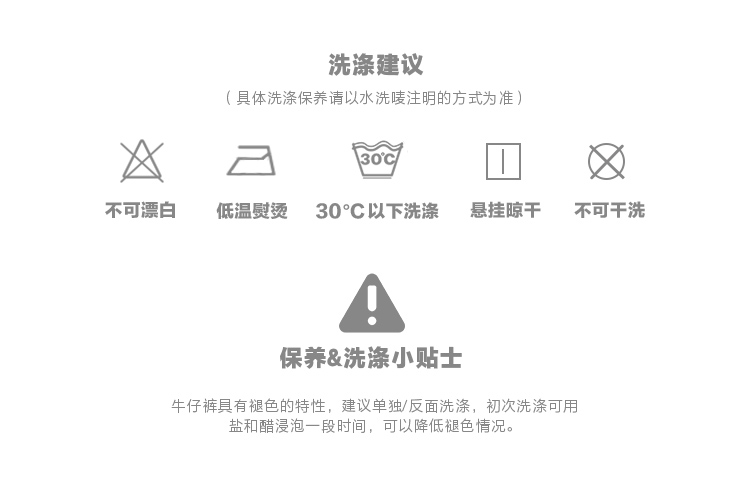 请单独反底洗涤,不可甩干。牛仔裤在洗涤时用食盐和醋浸泡后,固色效果更好。